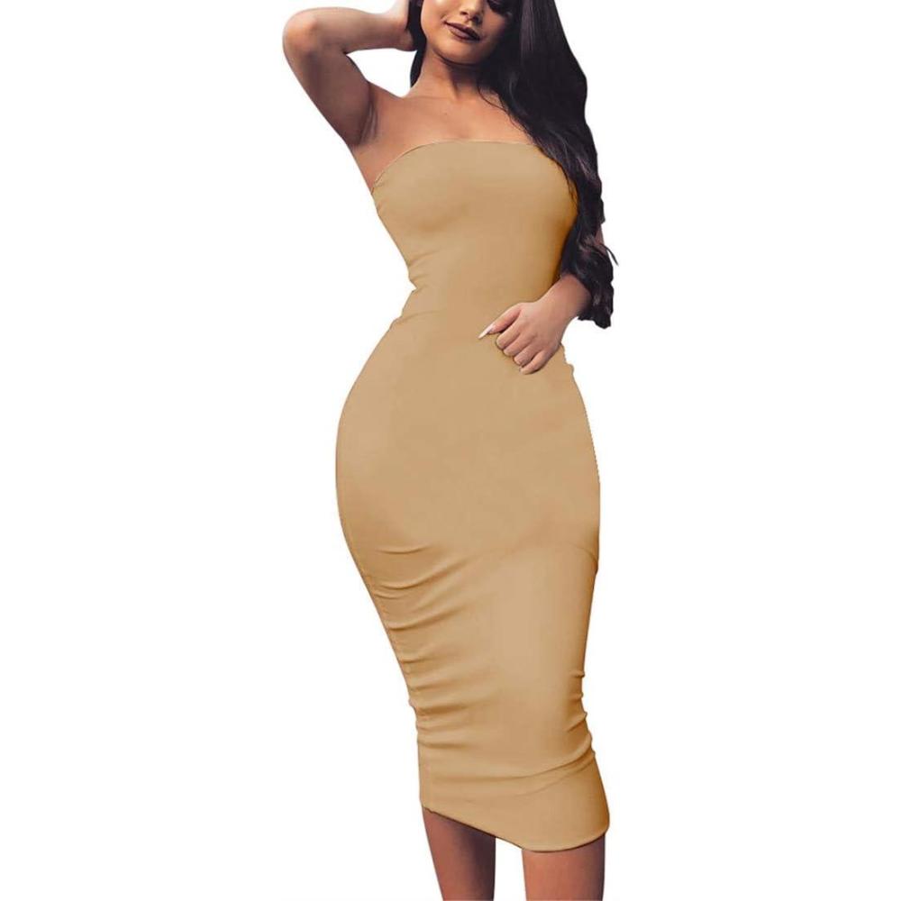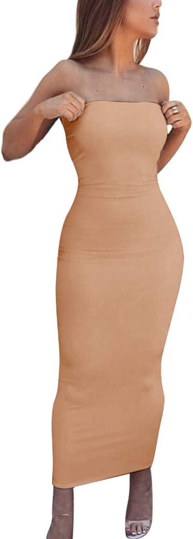 BORIFLORS Women’s Basic Sleeveless Tube Top Sexy Strapless Bodycon Midi Club Dress(Khaki)