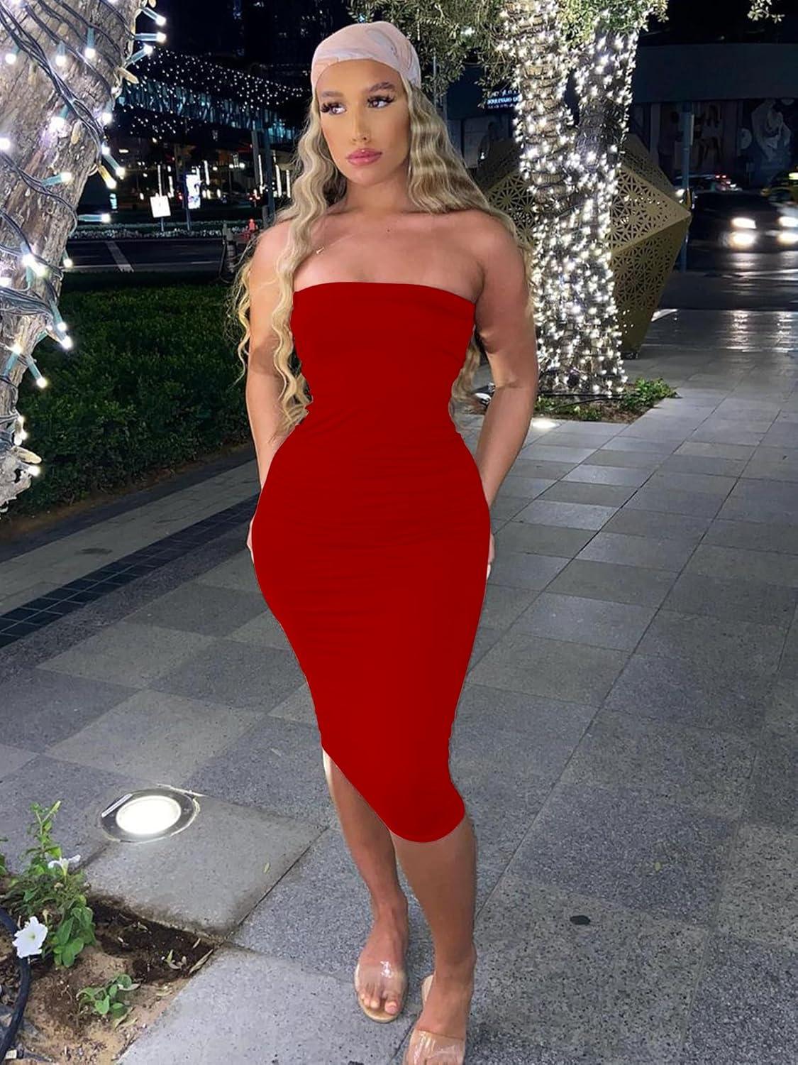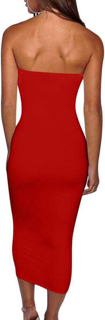 BORIFLORS Women’s Basic Sleeveless Tube Top Sexy Strapless Bodycon Midi Club Dress(Red)