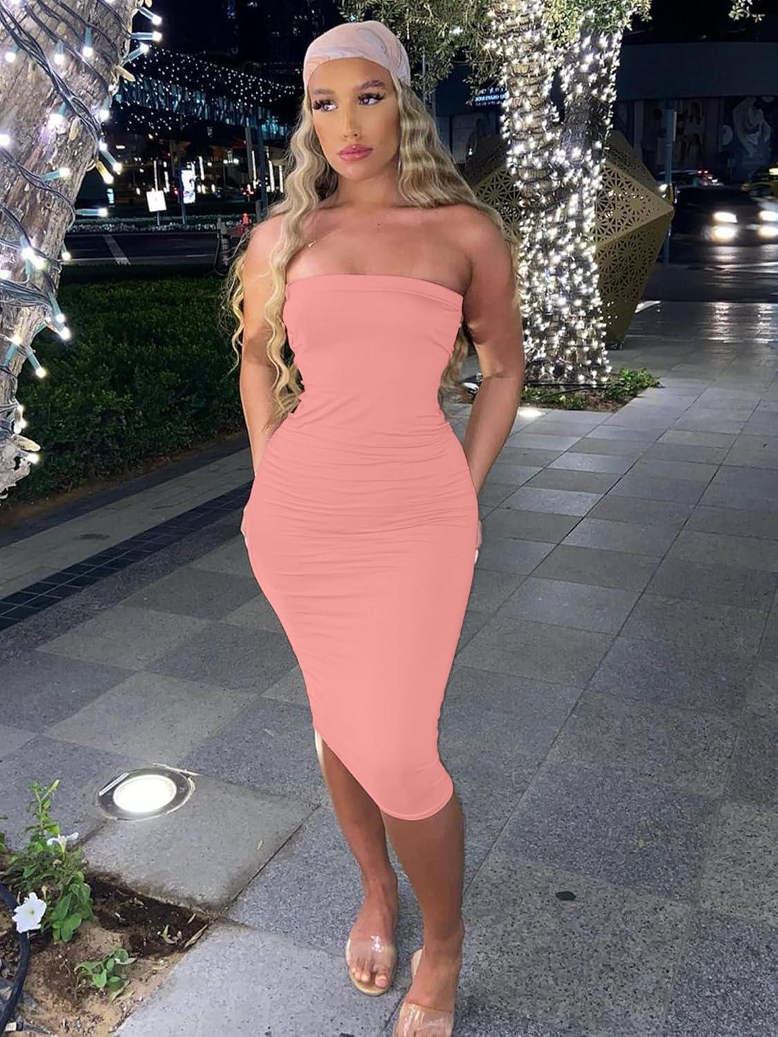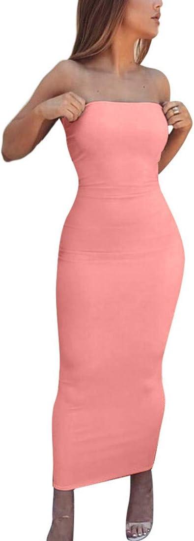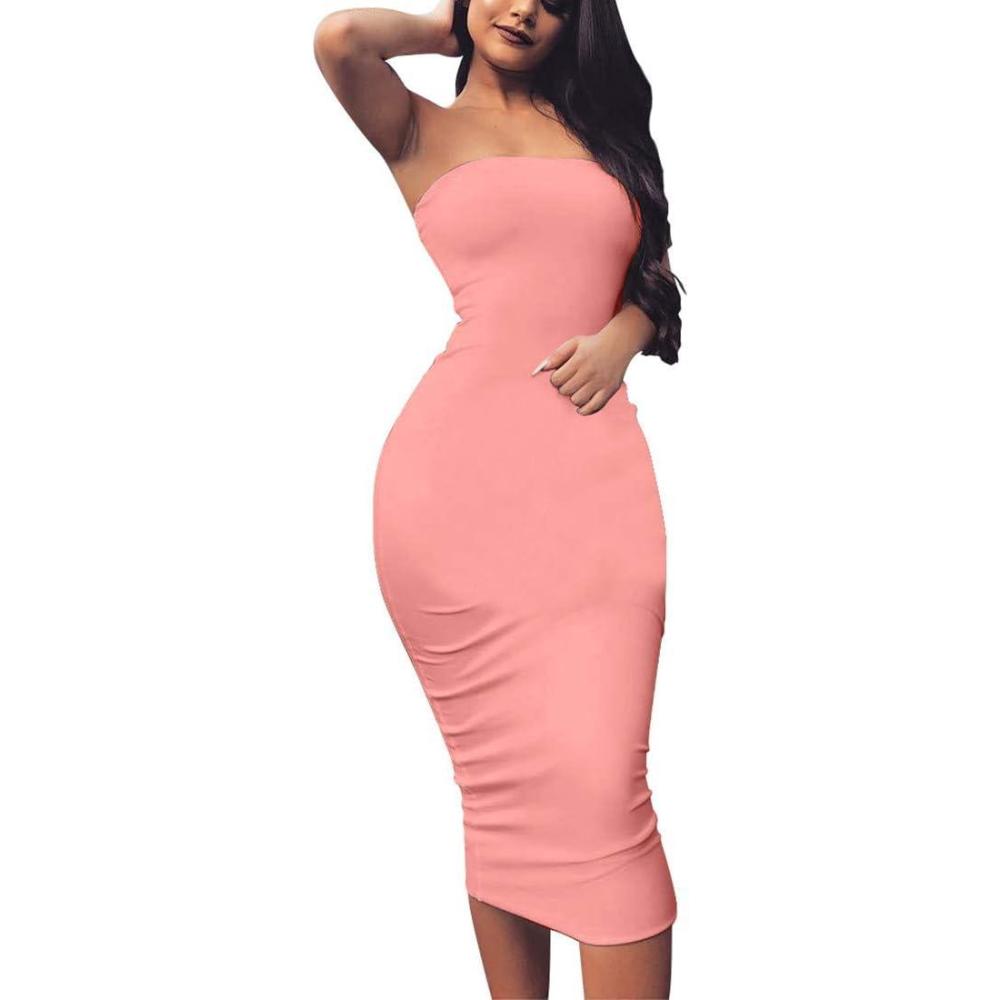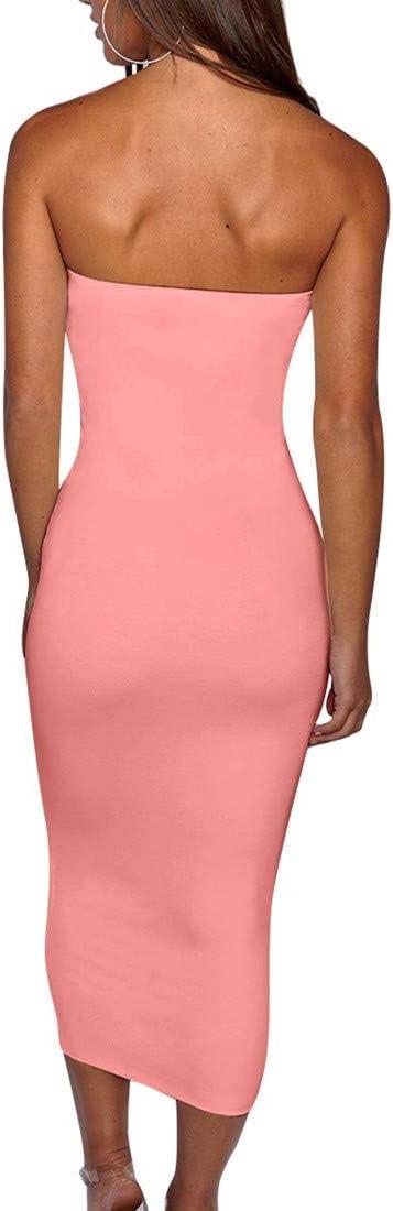 BORIFLORS Women’s Basic Sleeveless Tube Top Sexy Strapless Bodycon Midi Club Dress(Water Pink)