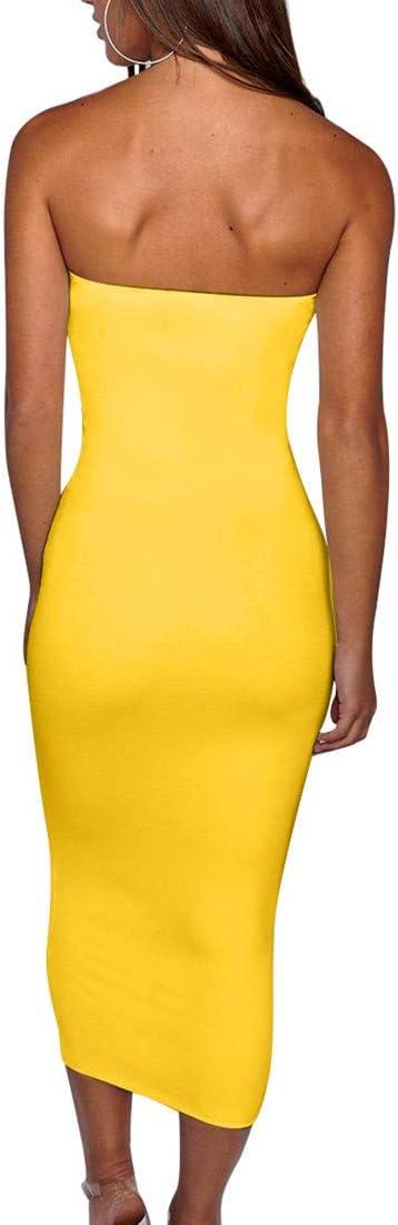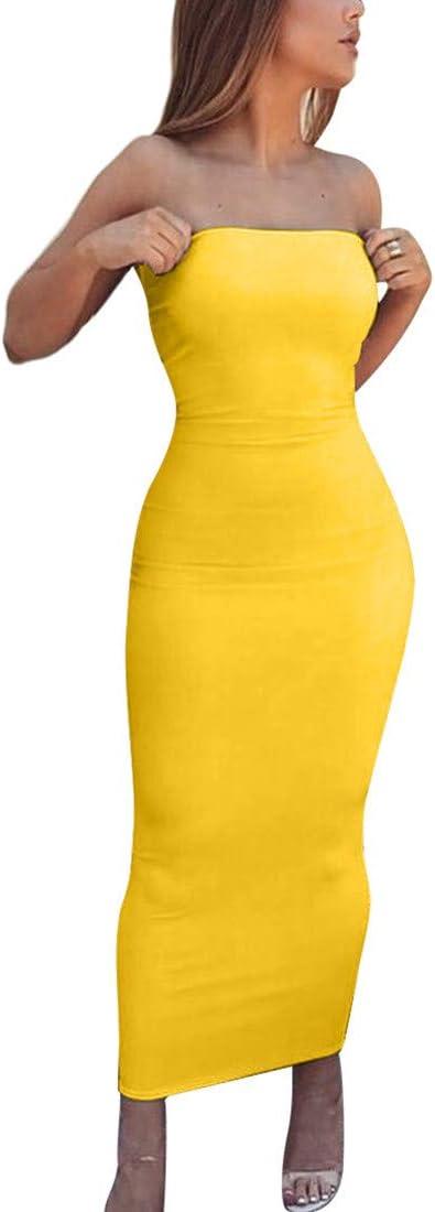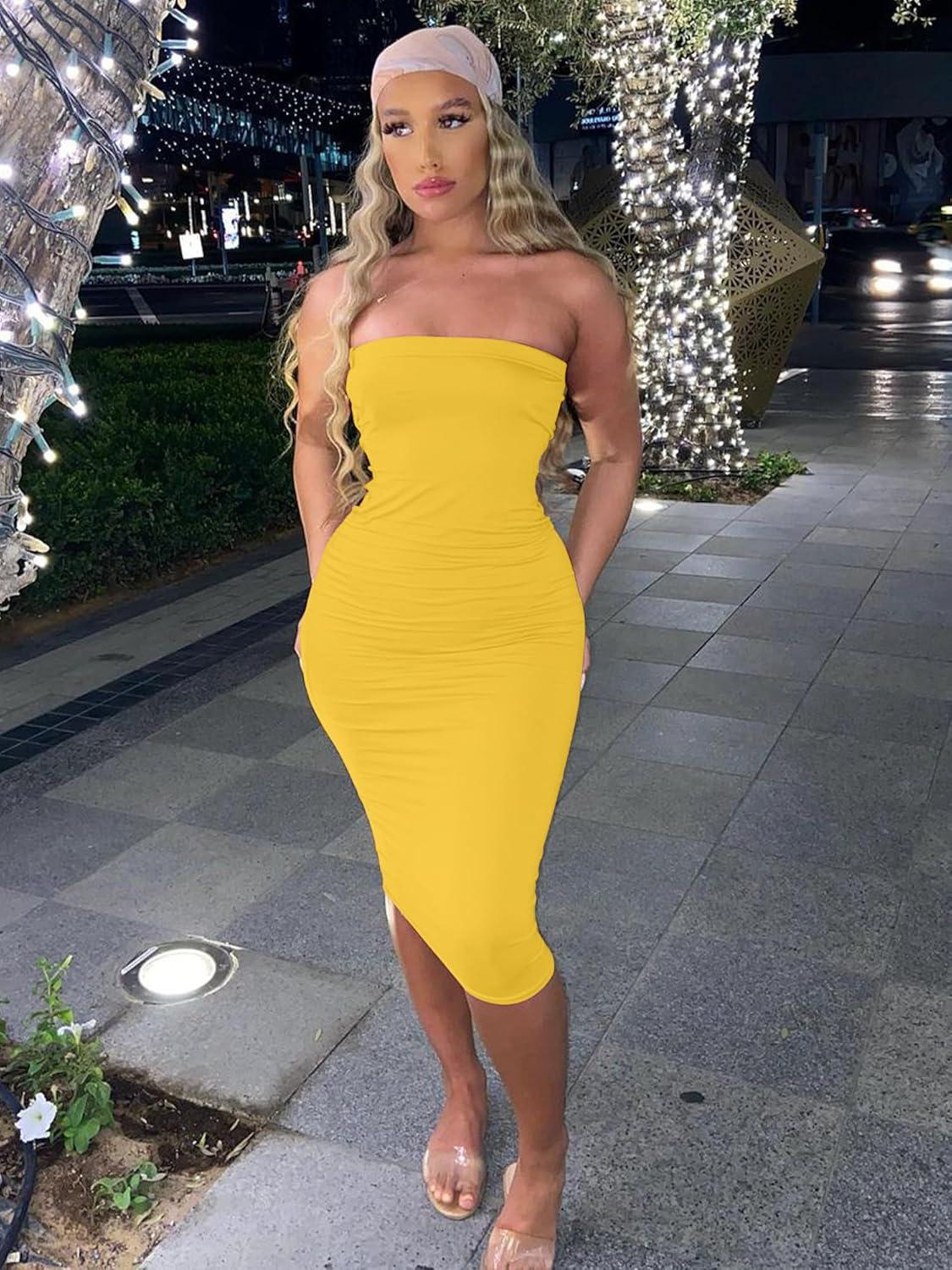 BORIFLORS Women’s Basic Sleeveless Tube Top Sexy Strapless Bodycon Midi Club Dress(Yellow)