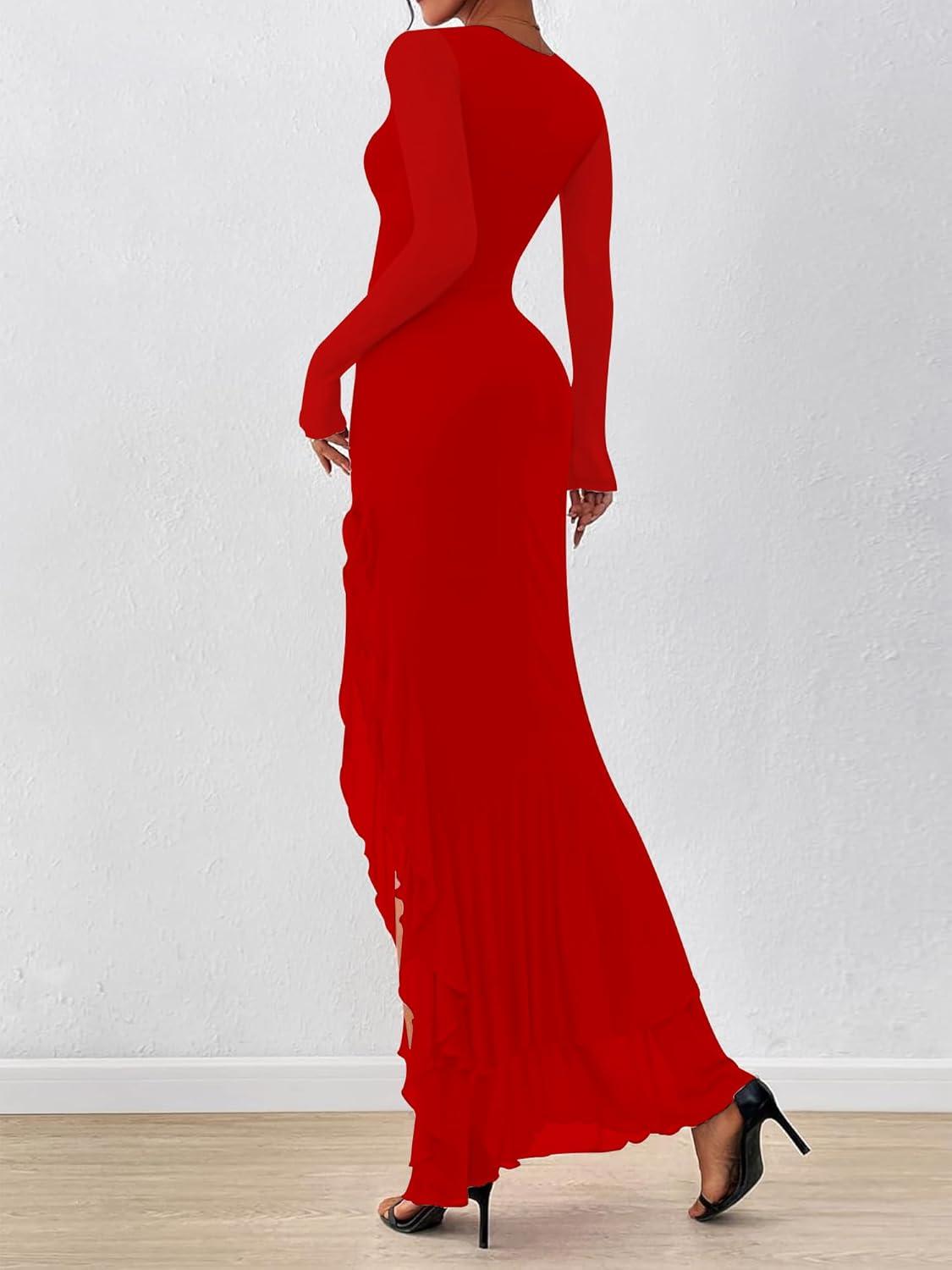 BORIFLORS Women’s Bodycon Ruched Mesh Long Sleeve Maxi Dress Mermaid Ruffle Formal Cocktail Party Long Dresses(Red)