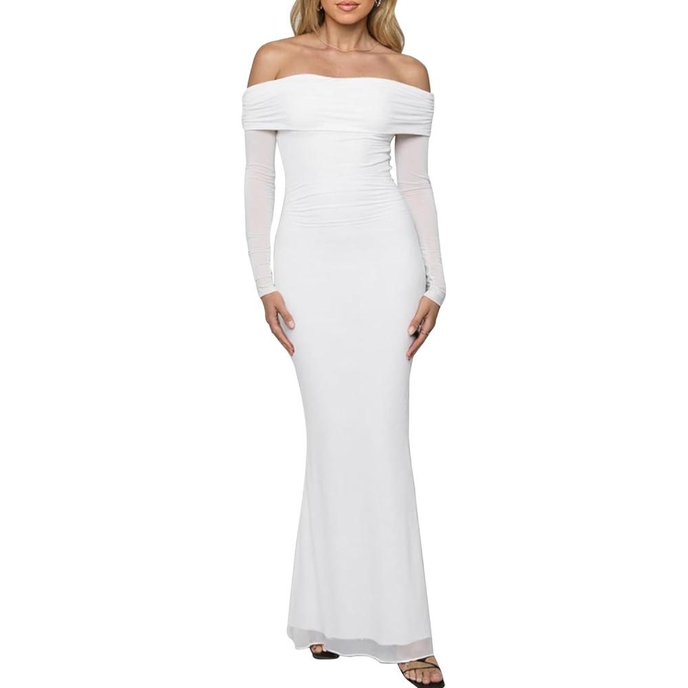 BORIFLORS Women’s Elegant Off The Shoulder Bodycon Long Sleeve Maxi Dress Mesh Cocktail Party Wedding Guest Formal Dresses(White)
