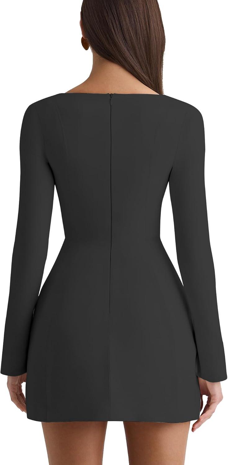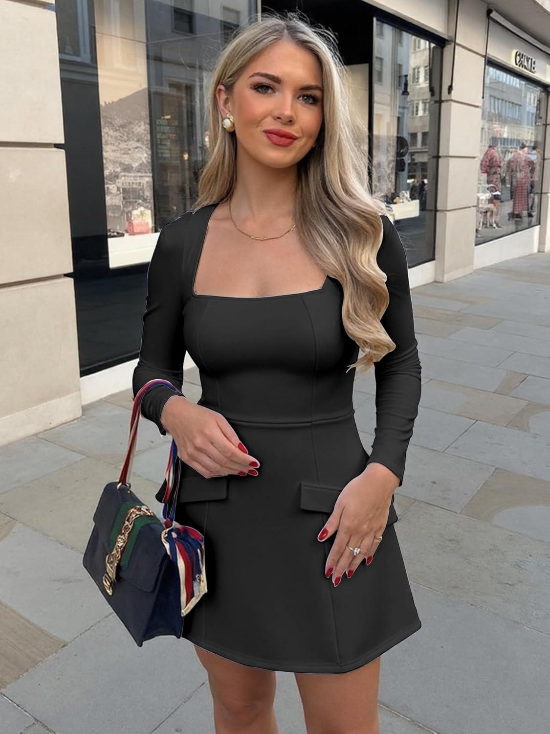 BORIFLORS Women’s Fall Square Neck Long Sleeve Mini Dresses Corset Basic A Line Party Short Dress(Black)