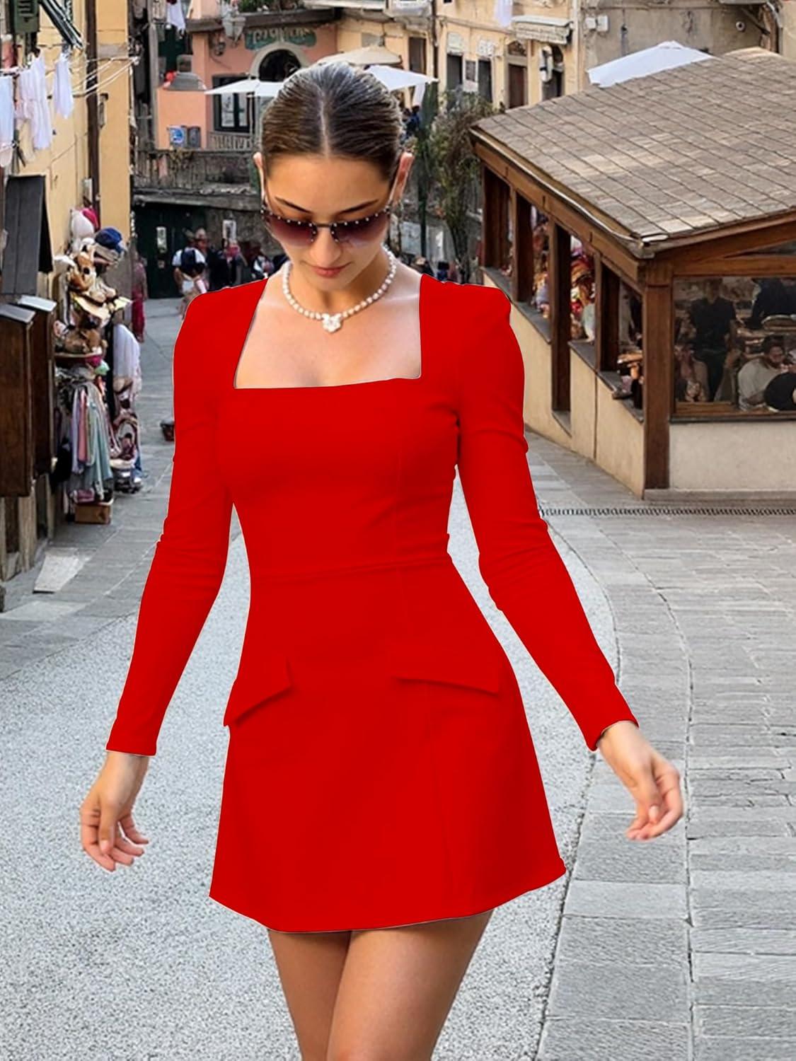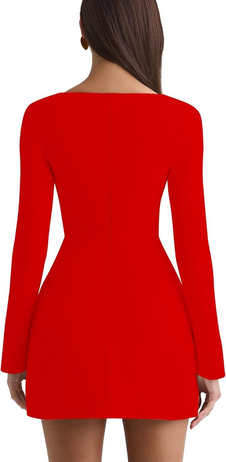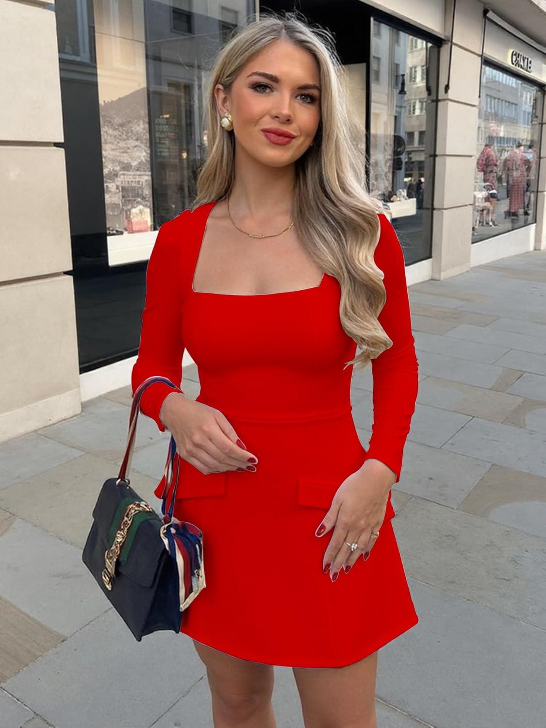 BORIFLORS Women’s Fall Square Neck Long Sleeve Mini Dresses Corset Basic A Line Party Short Dress(Red)