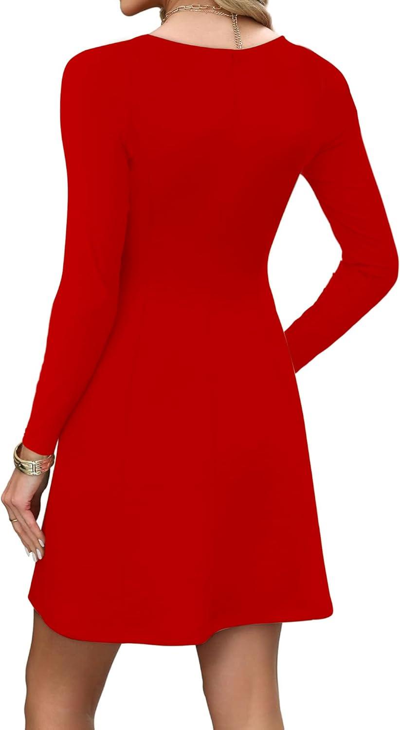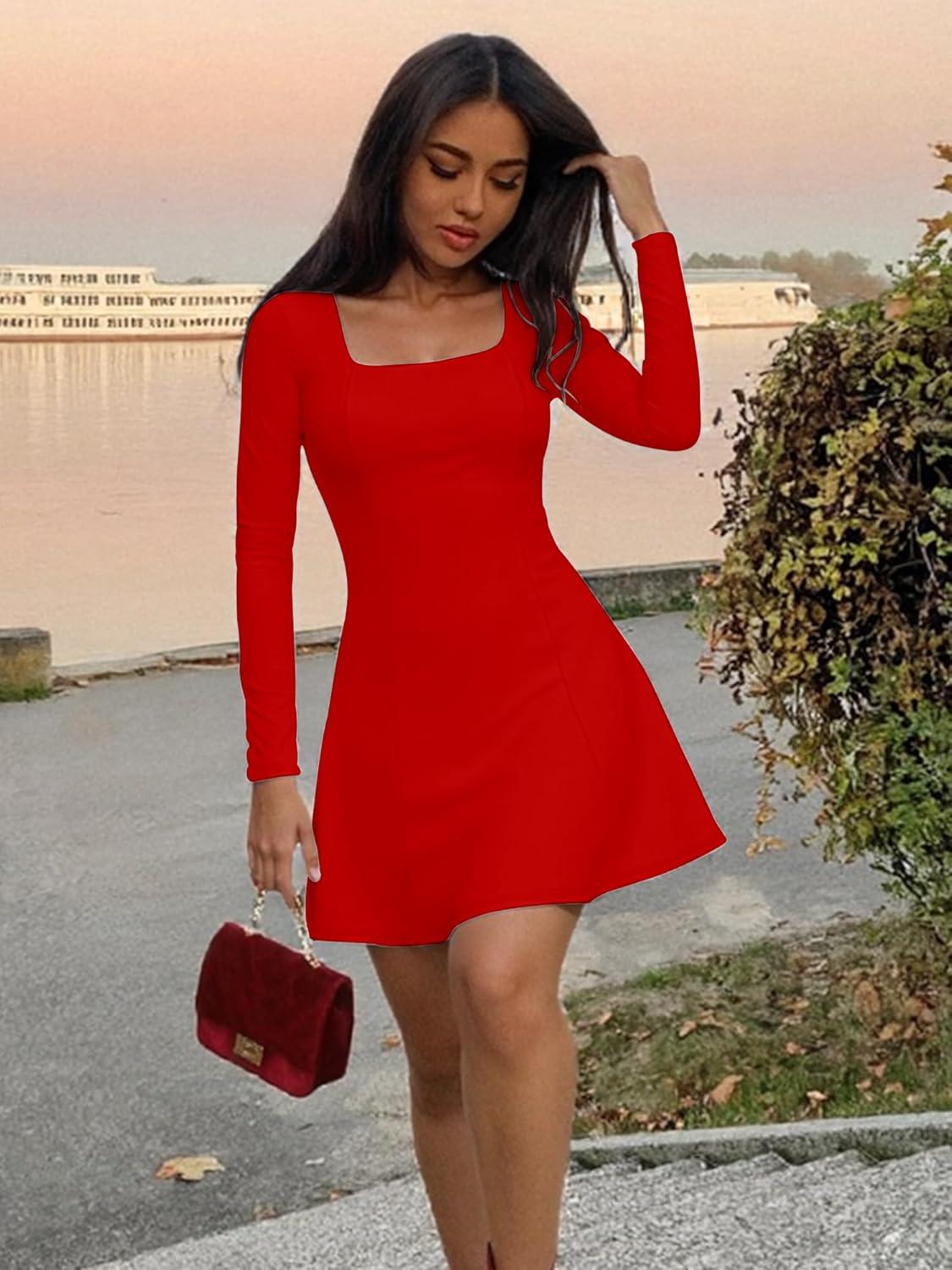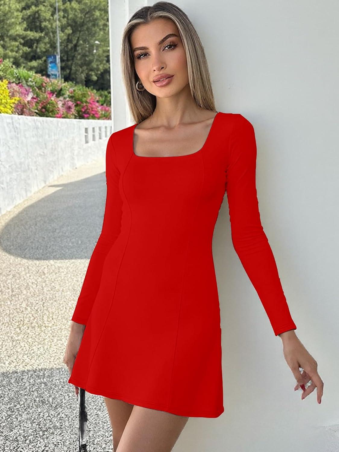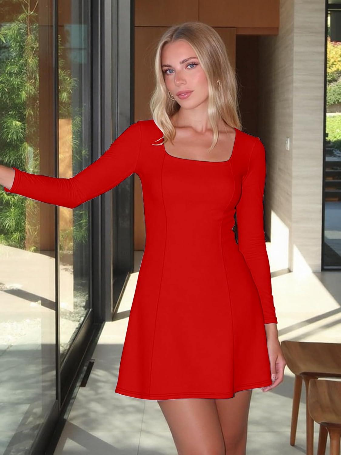 BORIFLORS Women’s Long Sleeve Square Neck Mini Dresses Fall Basic Casual A-line Party Short Dress(Red)