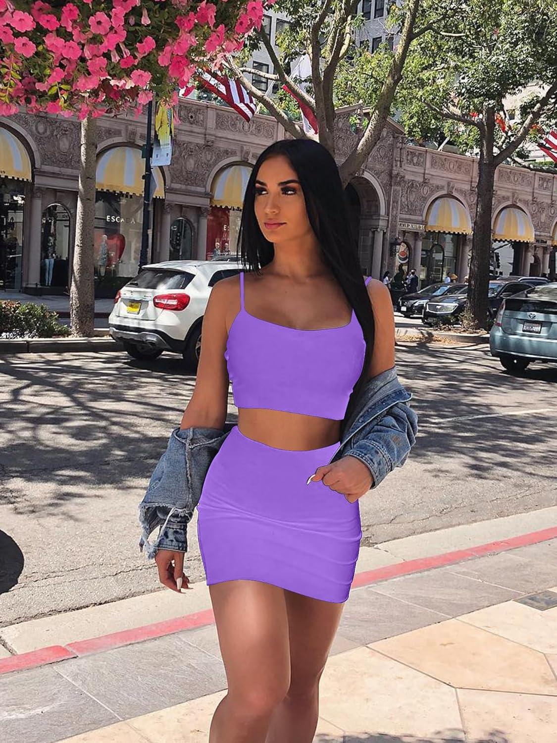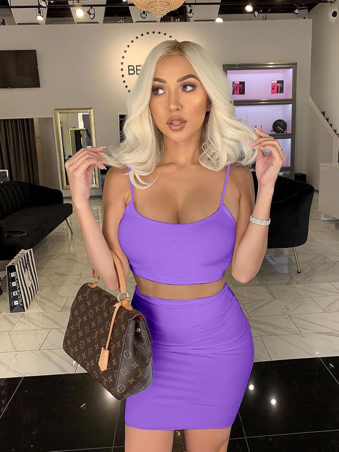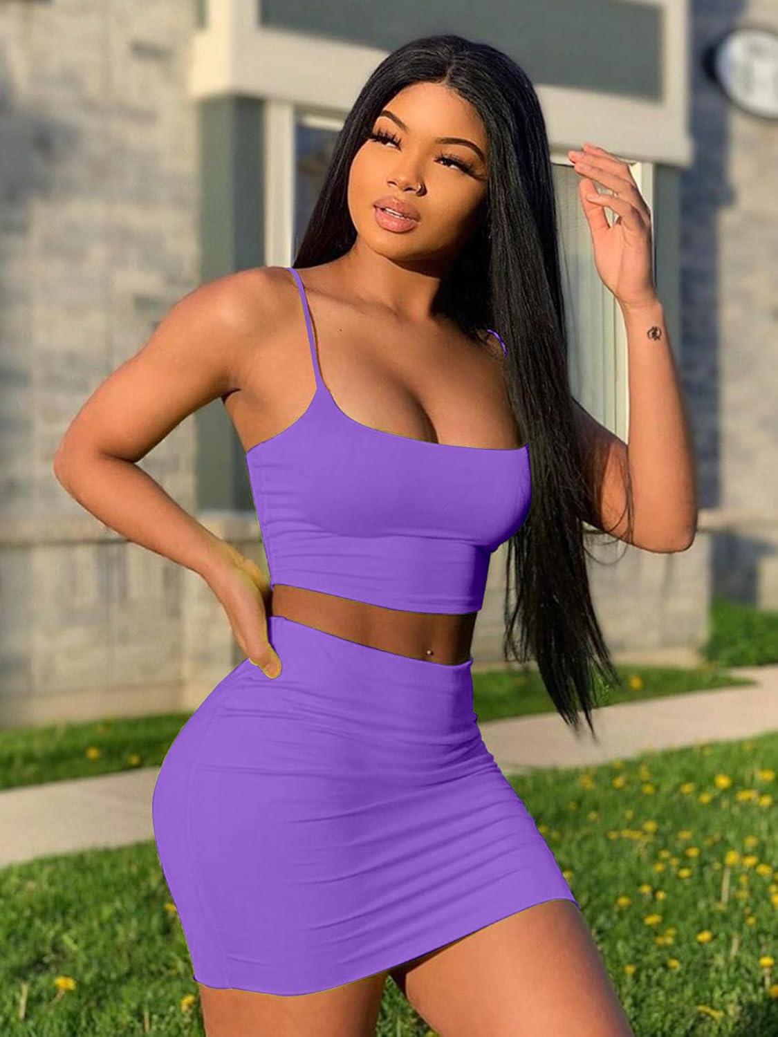 BORIFLORS Women’s Sexy 2 Piece Bodycon Mini Party Dresses Halloween Costume Strap Crop Top Short Skirt Set(Purple)