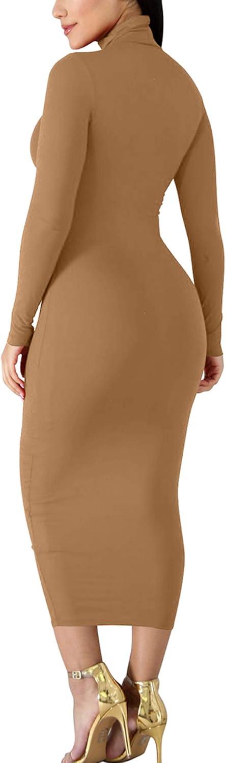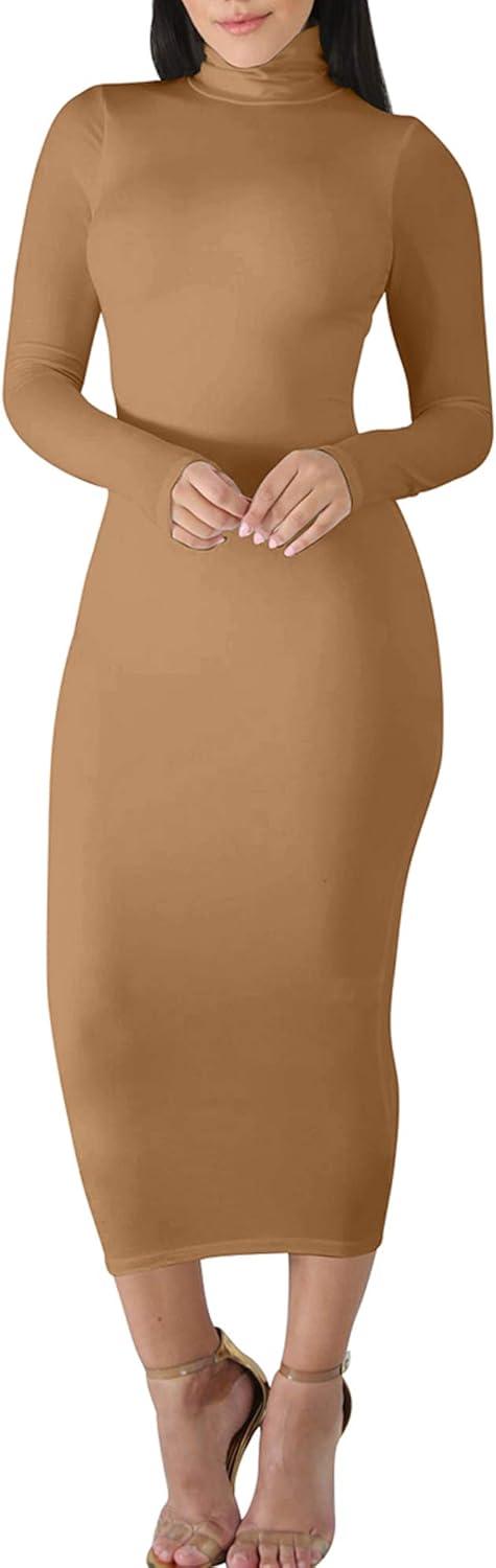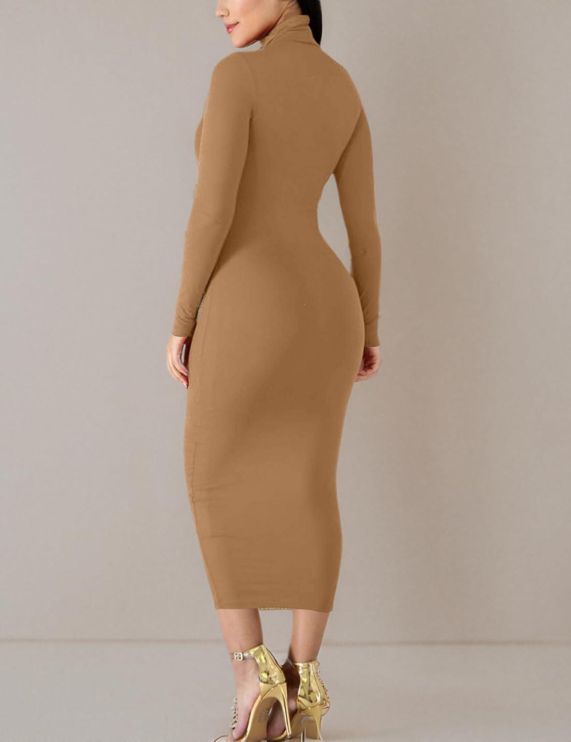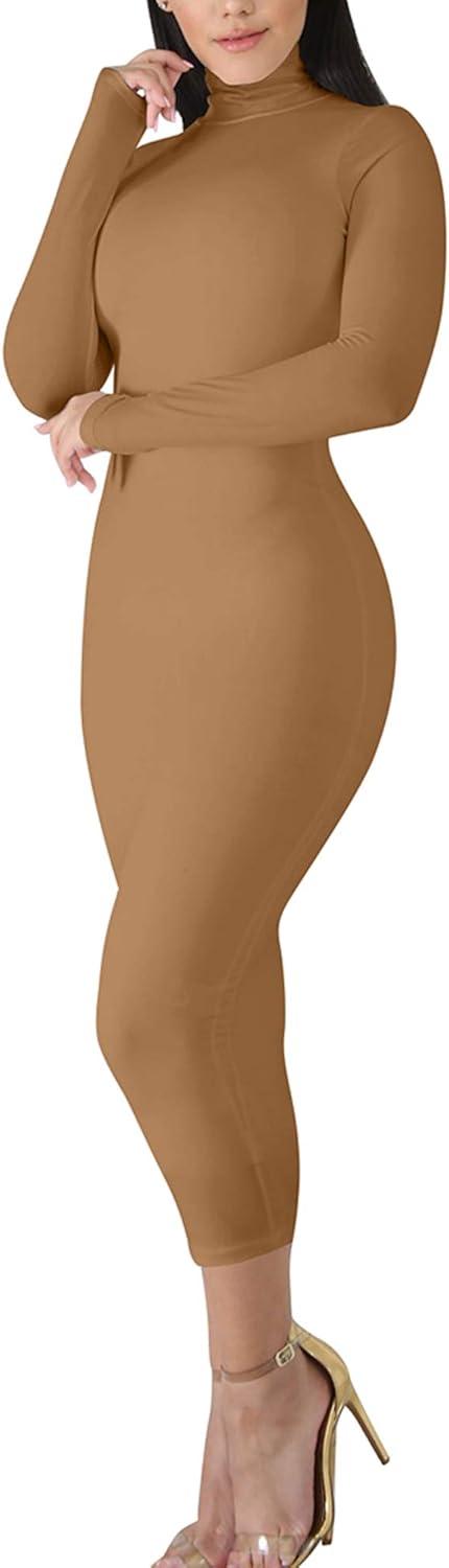 BORIFLORS Women’s Sexy Basic Long Sleeve Turtleneck Bodycon Party Long Pencil Dress(Khaki)