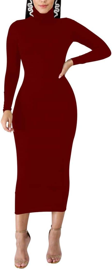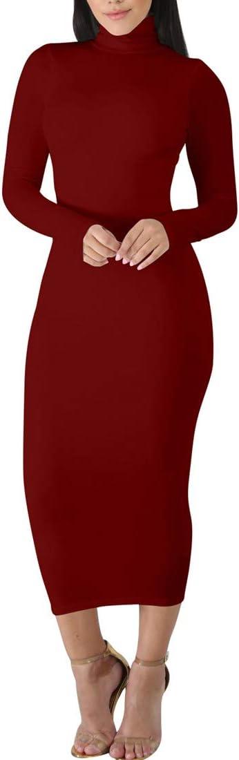 BORIFLORS Women’s Sexy Basic Long Sleeve Turtleneck Bodycon Party Long Pencil Dress(Wine Red)
