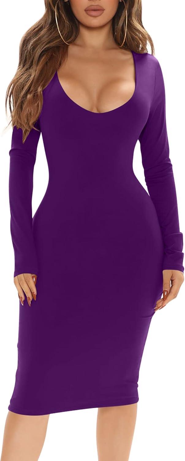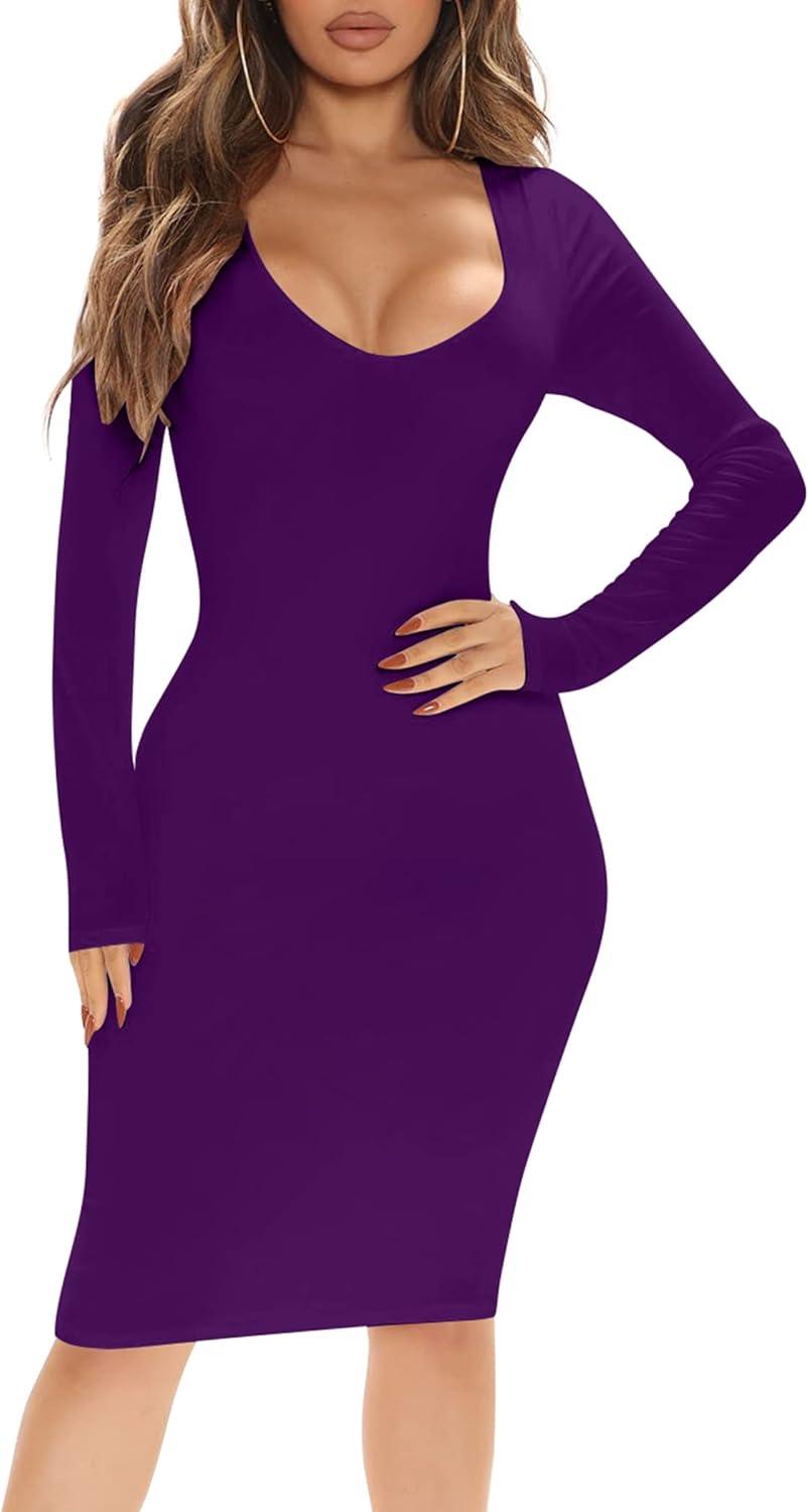 BORIFLORS Women’s Sexy Bodycon Long Sleeve Deep V Neck Club Party Midi Pencil Dresses(Dark Purple)