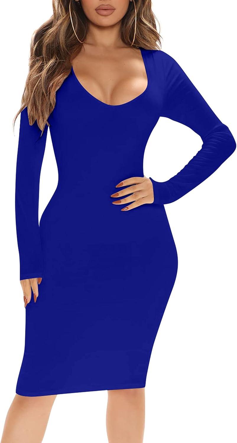 BORIFLORS Women’s Sexy Bodycon Long Sleeve Deep V Neck Club Party Midi Pencil Dresses(Royal Blue)