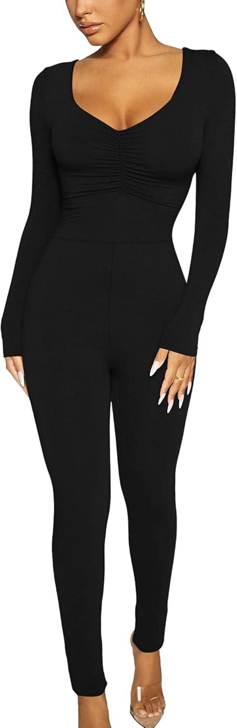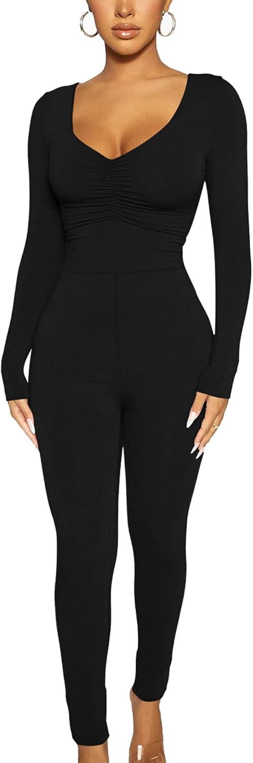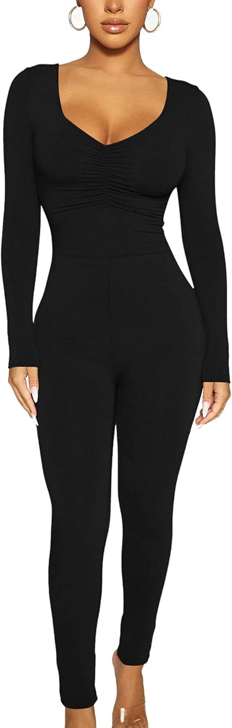 BORIFLORS Women’s Sexy Long Sleeve Bodycon One Piece Jumpsuits Club Outfits V Neck Ruched Rompers(Black)