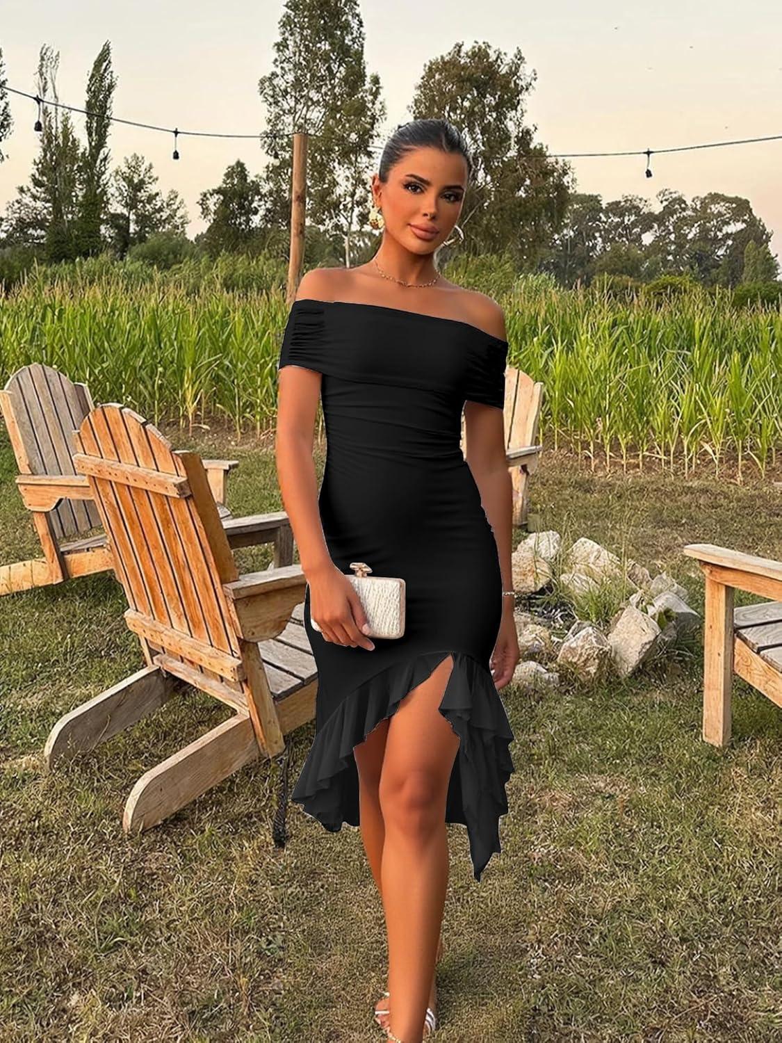 BORIFLORS Women’s Sexy Off The Shoulder Bodycon Midi Dresses Elegant Ruched Ruffle Hem Cocktail Party Dress(*Black)