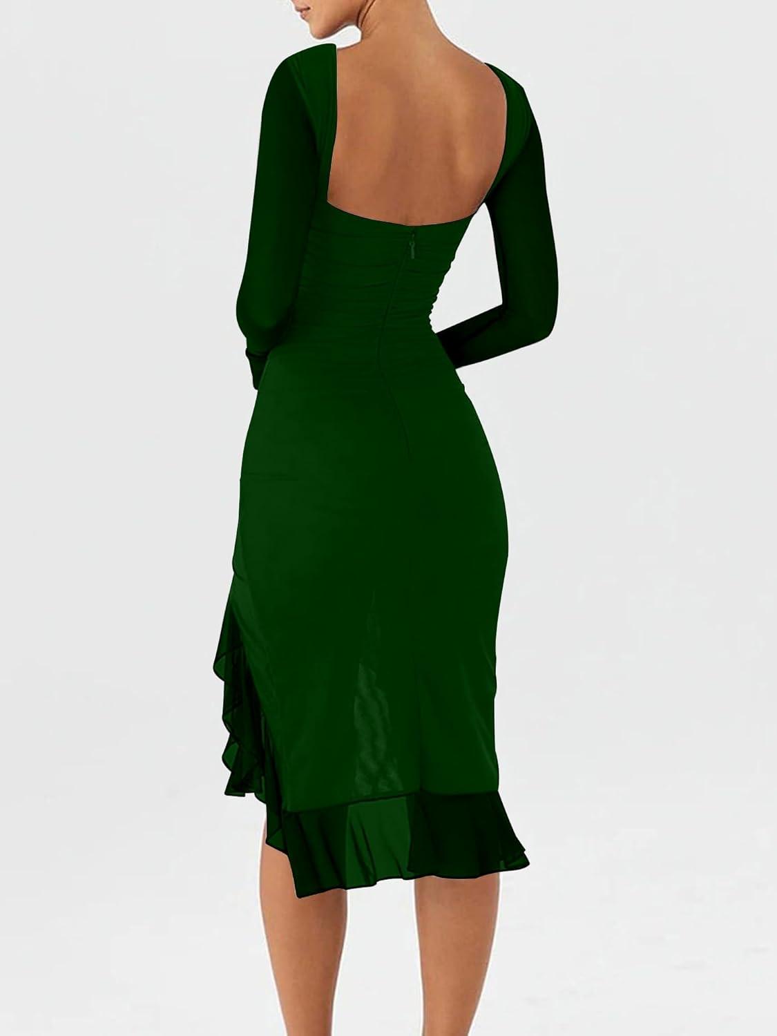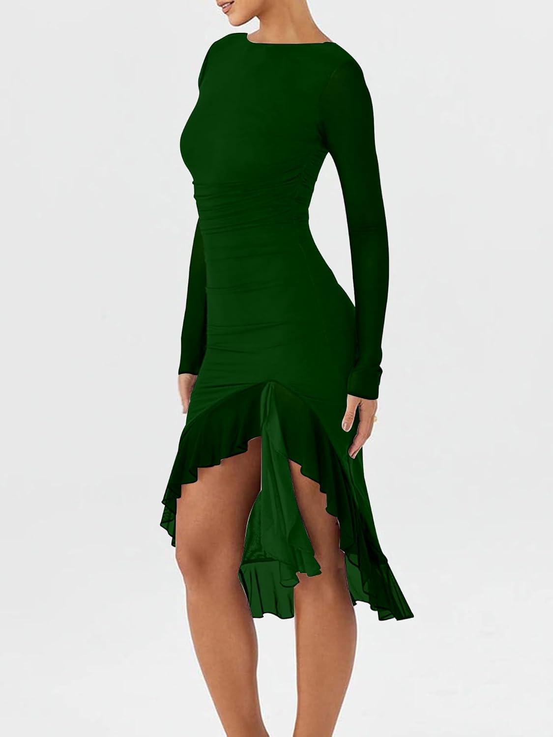 BORIFLORS Women’s Sexy Ruched Bodycon Midi Dresses Elegant Mesh Long Sleeve Ruffle Hem Cocktail Party Dress(Dark Green)