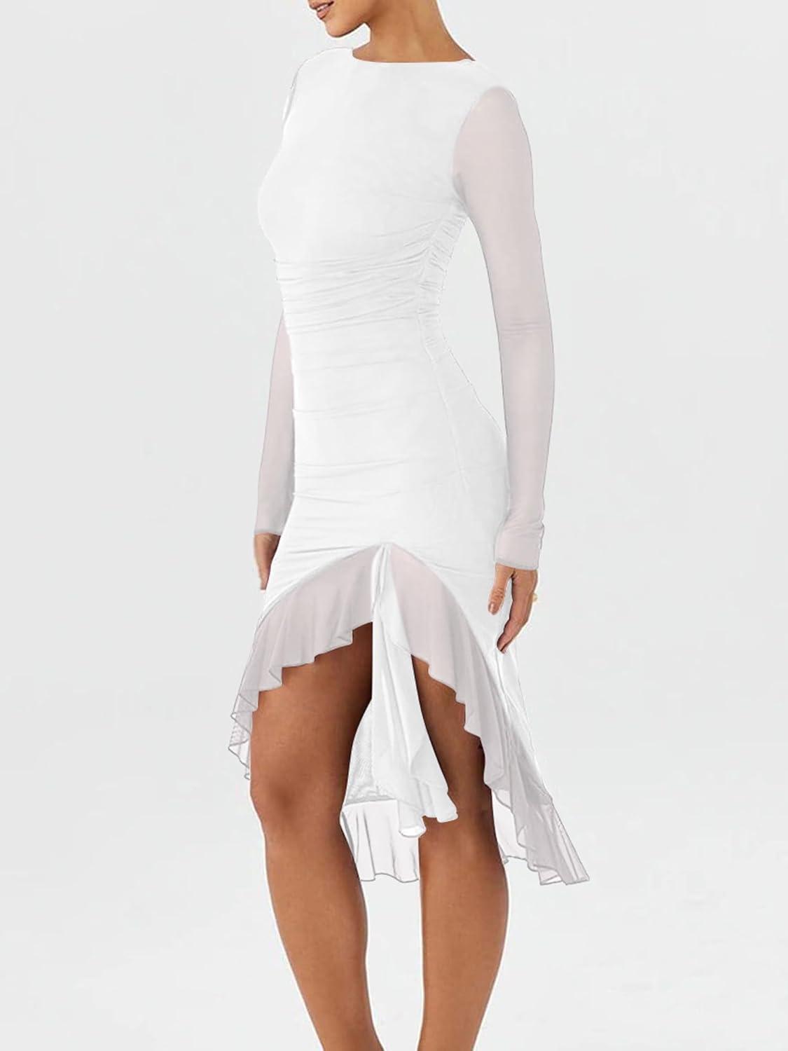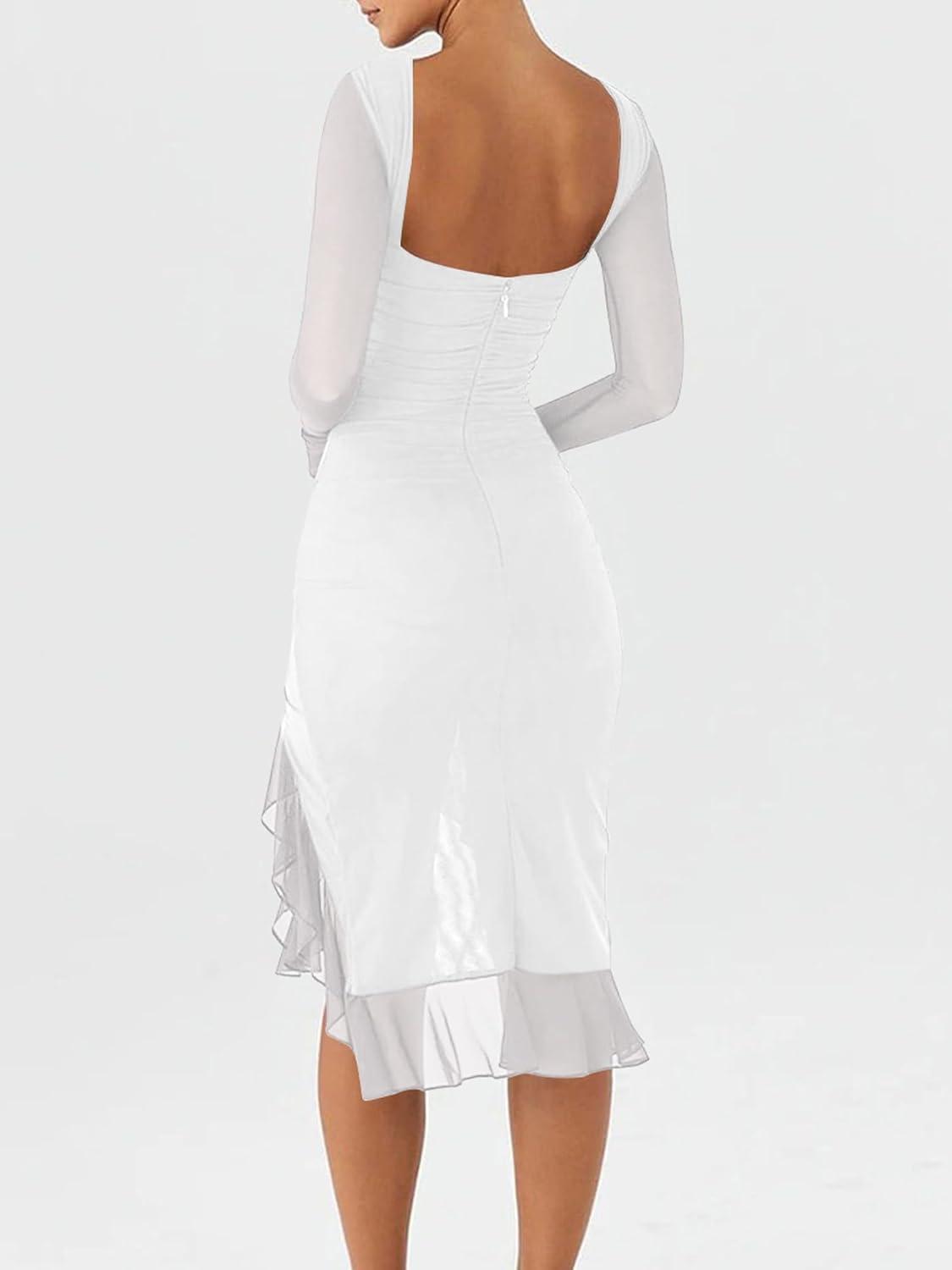 BORIFLORS Women’s Sexy Ruched Bodycon Midi Dresses Elegant Mesh Long Sleeve Ruffle Hem Cocktail Party Dress(White)