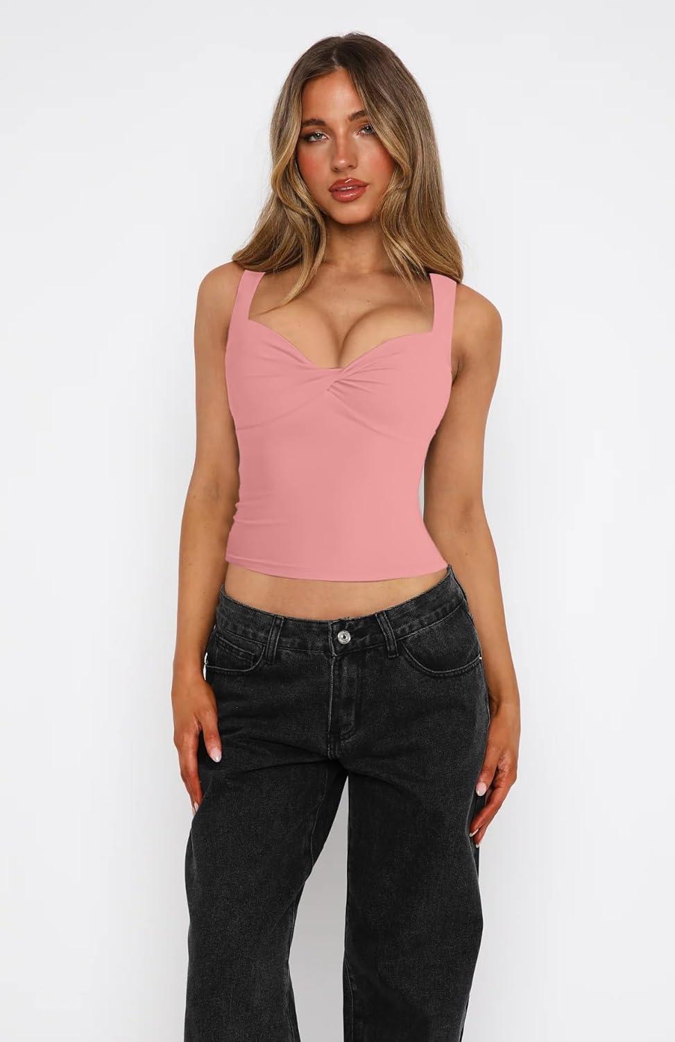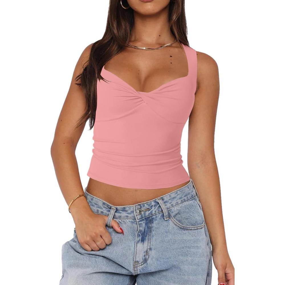 BORIFLORS Women’s Sexy Sleeveless Going Out Tops Double Lined Twist Front V Neck Trendy Cropped Tank Top