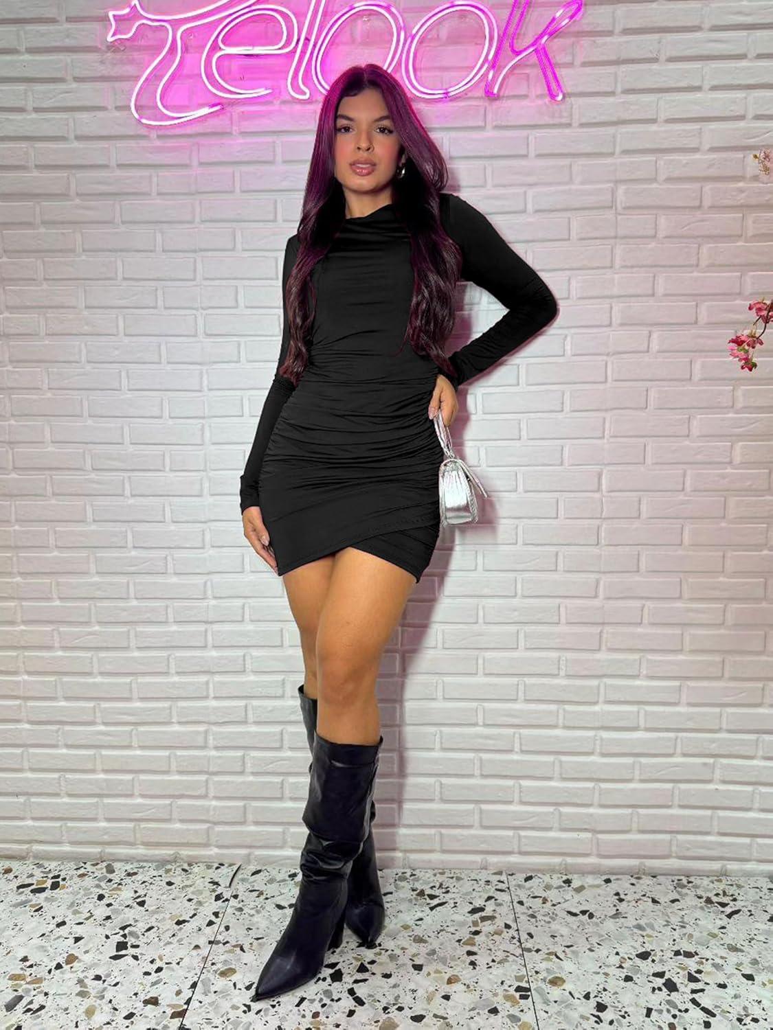 BORIFLORS Women’s Sexy Wrap Front Long Sleeve Ruched Bodycon Mini Club Dress(Black)