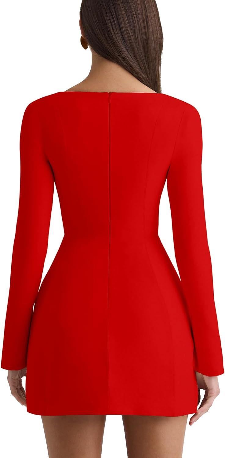 BORIFLORS Women’s Square Neck Long Sleeve Mini Dresses Corset Basic A-line Party Short Dress(Red)