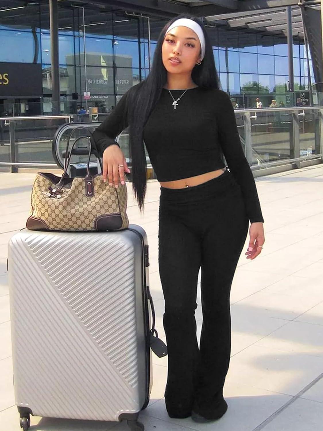 BORIFLORS Women’s Workout 2 Piece Lounge Sets Long Sleeve Tops Foldover Flare Pants Casual Outfits Tracksuit(Black)
