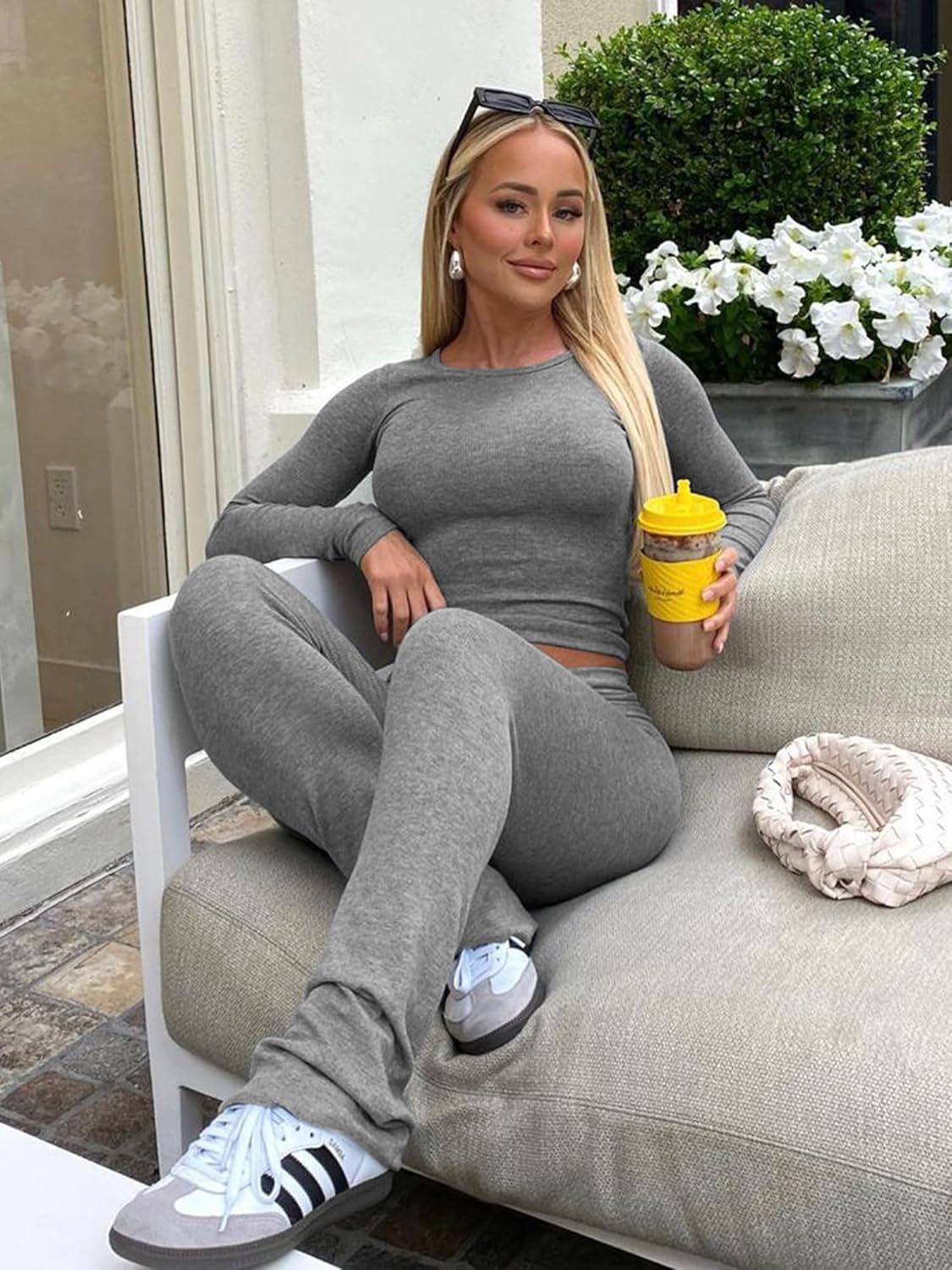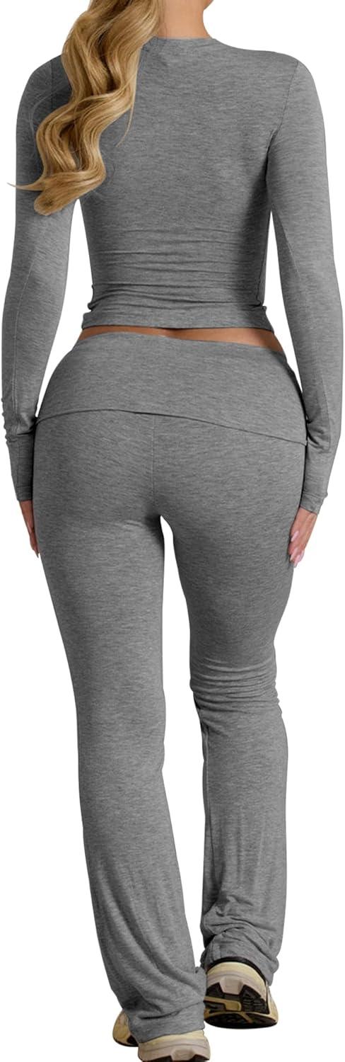 BORIFLORS Women’s Workout 2 Piece Lounge Sets Long Sleeve Tops Foldover Flare Pants Casual Outfits Tracksuit(Dark Grey)