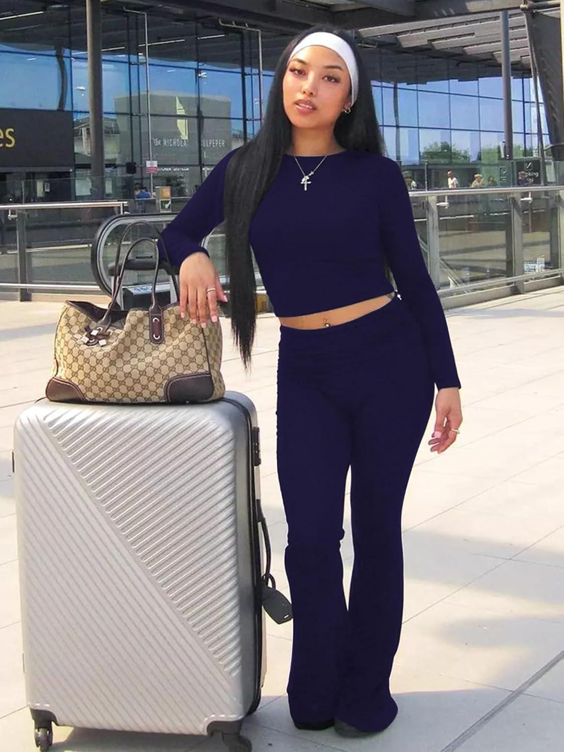 BORIFLORS Women’s Workout 2 Piece Lounge Sets Long Sleeve Tops Foldover Flare Pants Casual Outfits Tracksuit(Navy)
